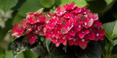 Glowing Embers (Hydrangea macrophylla 'Glowing Embers') is a compact mophead hydrangea with rich reddish-purple blooms that deepen as they age. It thrives in part shade with moist, well-drained soil and shows best color in slightly acidic to neutral conditions. Blooms on old wood, so prune only lightly. A dramatic and reliable variety for bold garden borders or shaded foundations.