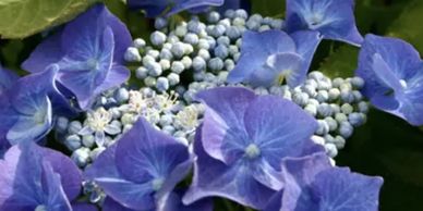 is an elegant lacecap hydrangea with vivid blue fertile centers surrounded by soft blue to lavender florets. It thrives in part shade with consistently moist, well-drained soil. Acidic conditions intensify its blue tones. Blooms on old wood—avoid pruning in fall or spring to preserve flower buds.